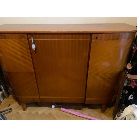 Trätoalett skåp med lock och förvaring. Skåpet är tillverkat i trä med synlig träådring och har ett överdel med uppfällbart lock och runt hål avsett för insats. Underdelen har en dörr som öppnas framifrån och rymmer ett fack med hylla för förvaring. Möbeln kan användas som torrtoalett med separat behållare eller som dekorativt förvaringsskåp efter egen anpassning.