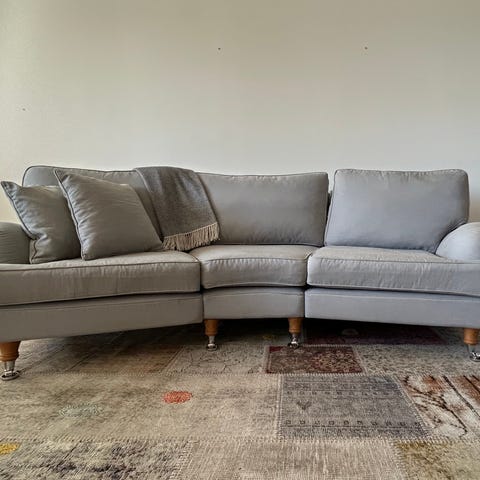 Ljusgrå klädsel och dynor kan vändas samt avtagbara för tvätt.