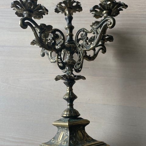 Tvåarmad ljusstake i metall. Plats för två ljus. Dekorativ fot och detaljerad utformning. Passar som bordsdekoration eller inredningsdetalj i hemmet.