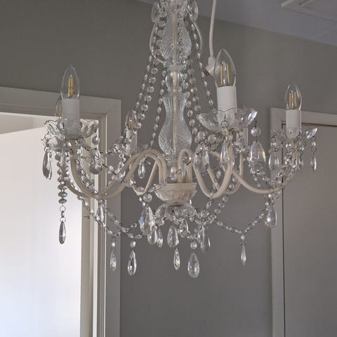 5 armad kristallkrona i mässing och glas. Nya elledningar. Fungerar perfekt En del kristaller behöver ny metalltråd i sina fästen. 2 fina vägglampetter med kristaller. Vridna kronljuslampor ingår.