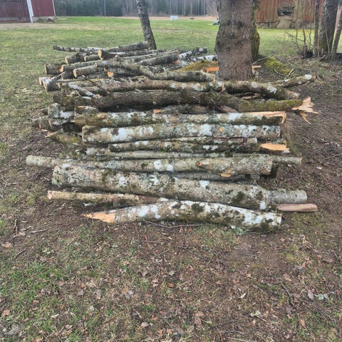 Säljer en hög med vedstockar, ca 3 meter långa.