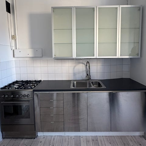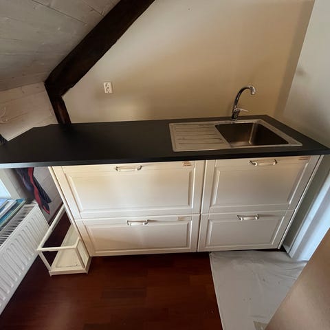 Skåpen är begagnade i ok skick. Överskåpen är 85 höga och 80 breda. Det mindre öppna överskåpet är 70 högt och 20 brett. Diskbänkskåpet är 60 brett, lådorna är 40 och skåpet till höger är också 40 brett. Köket är nedmonterat och finns i Ostnäs.