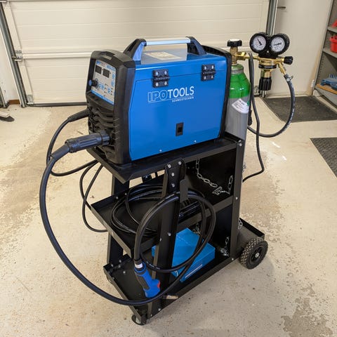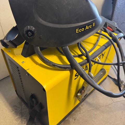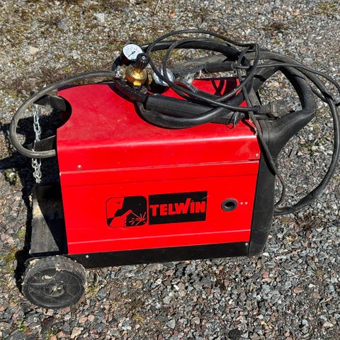 Easymig 208H som mest stått orörd i garaget. Monterad på vagn med hjul för enklare förflyttning. Lämplig för MIG-svetsning av olika metallmaterial i verkstad eller garage. Glasflaska och svetshjälm medföljer.