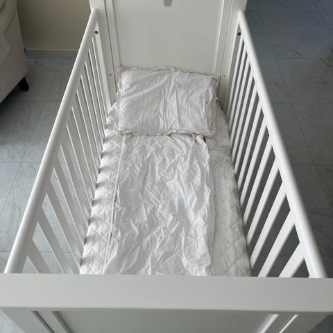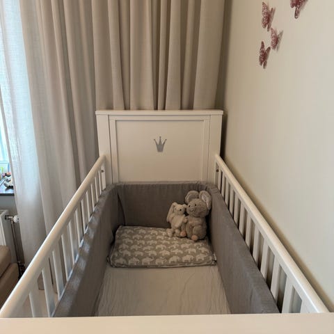 Madrasskydd, sängkläder, lakan, spjälskydd i muslin (beige/rosa) kan följa med för 200 kr.