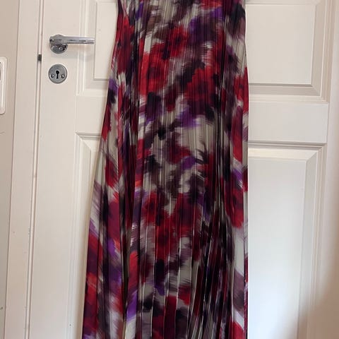 Modellen har smala axelband och draperad överdel med markerad byst. Kjoldelen är vid och faller rakt ned. Passar för fest och andra mer uppklädda tillfällen.