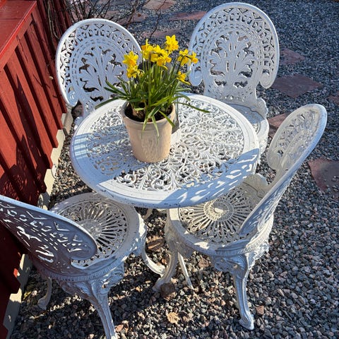 En antik och unik grupp i gjutjärn och trä som behöver renovering för att komma till sin rätt. Stolens armstöd är märkt med ”Ursvikens mekaniska verkstad”