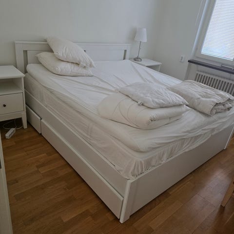 IKEA sängstomme med förvaring i vit färg. Sängstommen har fyra utdragbara lådor under liggytan som ger extra förvaringsutrymme för exempelvis sängkläder eller kläder. Passar i sovrum där man vill kombinera sovplats med praktisk förvaring. Madrass ingår inte. Två matchande sängbord ingår.