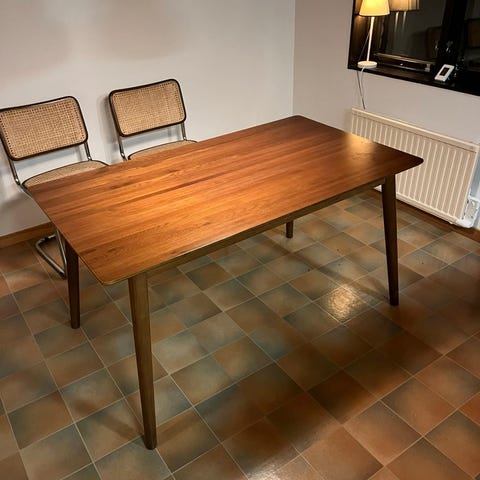 Praktiskt bord med infällbar iläggsskiva som gör att längden kan variera mellan 140 och 180 cm. Lite sliten men fullt funktionell. Hämtas i Dalen i Stockholm.