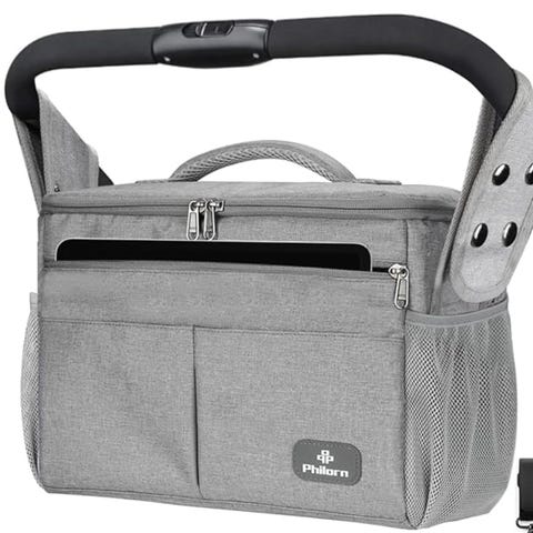 Bugaboo skötväska i grått tyg med svarta detaljer. Väskan har axelrem och bärhandtag samt flera ytter- och innerfack för förvaring av blöjor, flaskor och andra tillbehör. Kan fästas på barnvagnens handtag enligt bilderna och är anpassad för användning tillsammans med Bugaboo-vagnar. Passar för vardagsbruk med barnvagn och som organiserad förvaring vid utflykter.