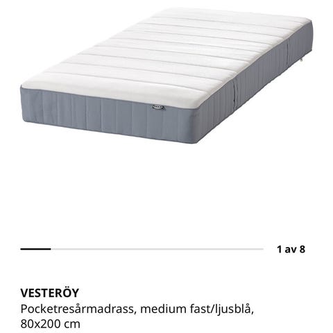 IKEA Vesterøy resårmadrass i vit och grå färg. Madrassen har en slät, quiltad ovansida och grått tyg runt sidorna. Passar som liggyta i sängram eller på ribbotten. Lämplig för en person eller som del i en dubbelsäng beroende på storlek på sängram och mått på madrassen.