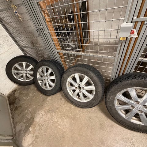 Däck med fälgar i dimensionen 195/65R15. Svarta lättmetallfälgar med 5x100