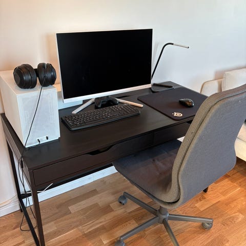 Okänd bärbar dator med cirka 15-tums skärm. Datorn syns placerad på ett skrivbord tillsammans med extern skärm, tangentbord och mus. Exakt modell, processor, lagringsutrymme och övriga tekniska specifikationer framgår inte av bilderna. Passar generellt för vardagligt kontors- och hemanvändande beroende på faktisk hårdvara och skick, som behöver kontrolleras vid köp.