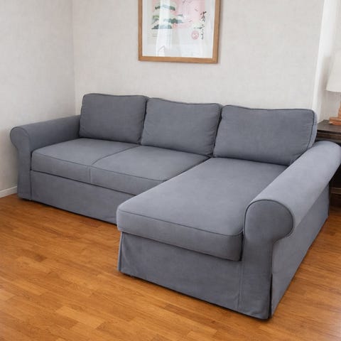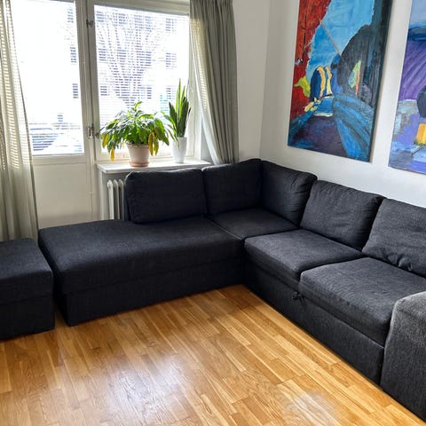 Mörkgrå kvalitets soffa med rejält hållbart tyg! Själva sängen i bäddsoffan är oanvänd och ser helt ny ut! Soffan är tre år gammal och i bra skick! Skrubbat den överallt med diskmedel och varmt vatten, damsög hela efter det med en ny bra grovdamsugare och har strött på bikarbonat så allt smuts ska sugas upp och bli som ny! Ni kan bara gå över en omgång till pga lite märken efter dammsugaren om ni vill!