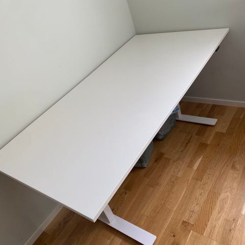 Höj- & sänkbart skrivbord från Rusta, 160x80 cm. Har mest stått orört i hemmakontoret. LED-slinga monterad på undersidan i efterhand, går att ta bort. Nypris 3299:-