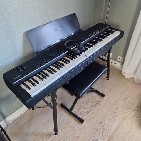 Keyboarden har fullstor klaviatur med flera oktaver och inbyggda högtalare. Ovanför tangenterna finns kontrollpanel med olika ljud, rytmer och funktioner som kan väljas via knappar. Notställ är integrerat på ovansidan. Passar för hemmabruk, övning och enklare musikproduktion. Säljs tillsammans med stativ och matchande pall enligt bild.