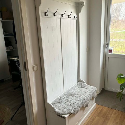 Säljer en fin Hemnes förvaringsbänk i färgen vit med handstång & fyra krokar, bänken är i nyskick.
