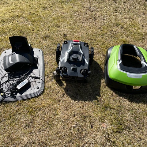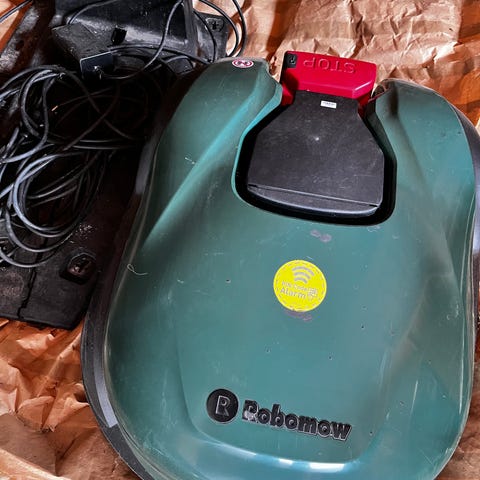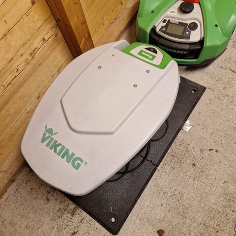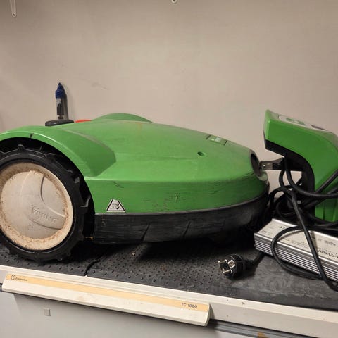 Den mörkgröna är en Robomow av likadan modell att ta delar från då åskan har tagit både laddstation och klipparen beter sig konstigt.