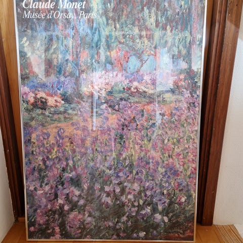 Claude Monet konsttryck i färg, inramat med enkel träram och vit passepartout. Motivet föreställer en trädgårdsscen med dukat bord och personer bland blommor. Trycket är rektangulärt och glas skyddar bilden i ramen.