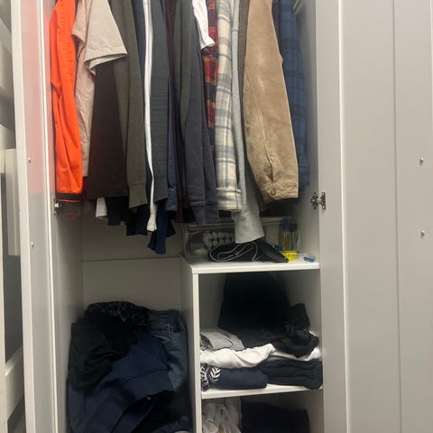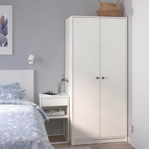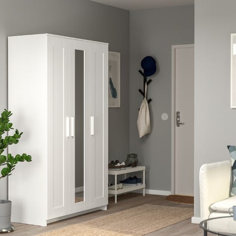 klädskåpet har en klädstång för skjortor och klänningar, hyllplan för vikta kläder, skor och väskor – och även spegeldörr så du slipper hänga upp en separat spegel.