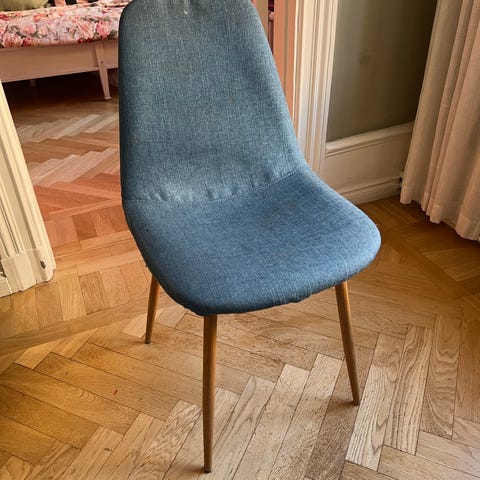 Ekben, brunt konstläder. Är i använt skick men har mer att ge. En har en synlig lite skada på sitsen och en annan ett skrapmärke på ryggstödet där av 8-10 stolar men inget fel på funktionen.