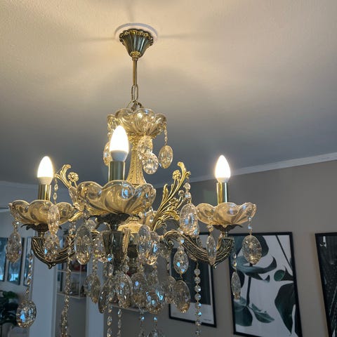 Säljer en elegant kristallkrona med flera armar och dekorativa prismor i kristall.Ger ett lyxigt och stämningsfullt ljus,perfekt till vardagsrum,matsal eller hall.