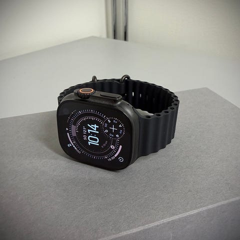 Apple Watch Ultra 2 (GPS+Cellular) med 49 mm boett i titan och svart armband.