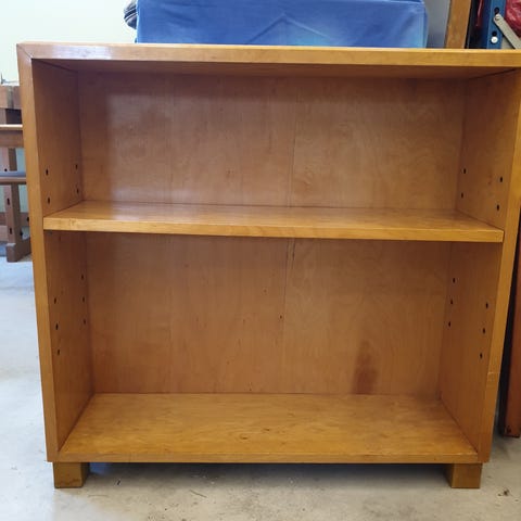 Trämöbel i form av en bokhylla med inbyggd radio. Möbeln är i brun träfinish med flera öppna hyllplan för förvaring av böcker eller andra föremål. På ena sidan finns ett separat fack där radion är placerad. Radion har frontpanel i trä med dekorativa vertikala detaljer, tygklädda öppningar och en rektangulär display samt rattar på vardera sida. Möbeln passar exempelvis i vardagsrum eller allrum som kombinerad förvaring och inredningsdetalj.