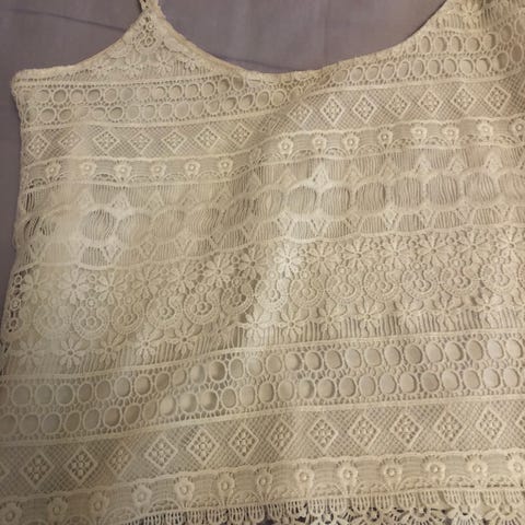 Ärmlös topp i spets med dragkedja baktill. Toppen har en rundad halsringning fram och en V-ringning bak. Spetsmönstret varierar med blommiga och cirkulära detaljer, vilket ger en skiktad effekt. Den är genombruten och har en dekorativ dragkedja längs hela ryggen.