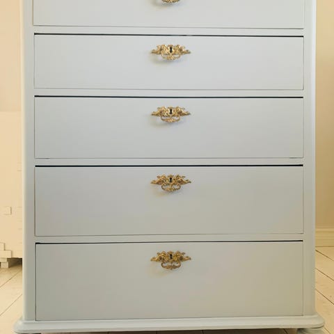 Den har flera smarta lådor och fack samt en nedfällbar skrivyta som gör den både funktionell och stilren. Ett riktigt fint möbelstycke med karaktär!