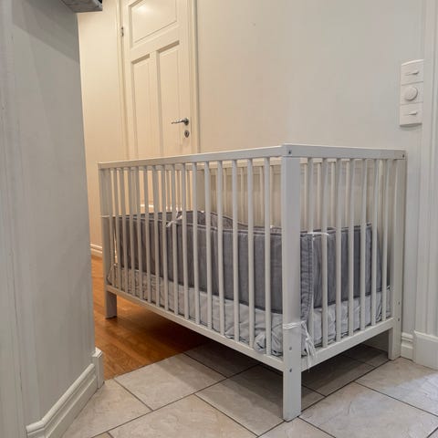 En spjälsida kan tas bort när barnet blir större och finns då en stödbräda att fästa