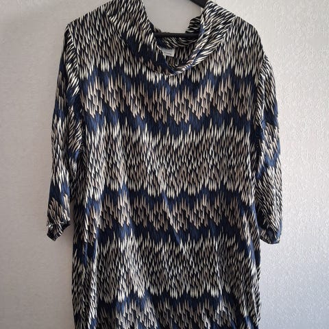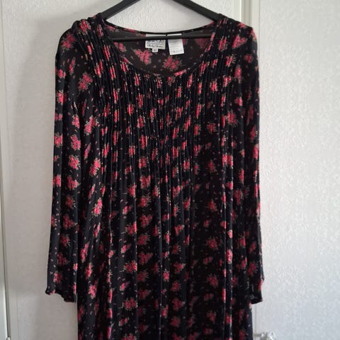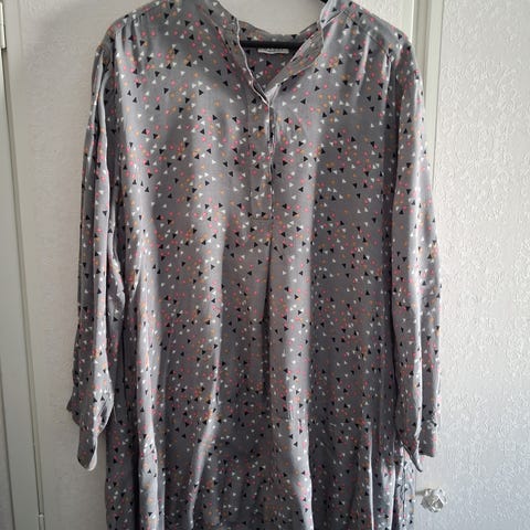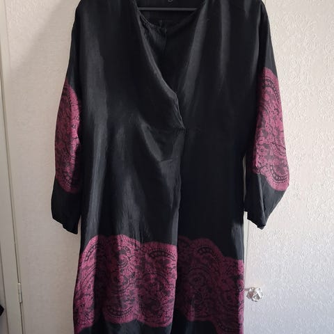 Kort fin klänning från Masai för dam i storlek XL. Klänningen är grå med diskret mönster i lila och har rynkad överdel, smock med band under. Rund ringning samt ett litet sprund. Tillverkad i blank viskos, vilket ger ett mjukt och följsamt fall. Modellen har längre puffärmar och knytband nedtill som kan justeras. Passar för fest och andra mer uppklädda tillfällen. Fickor i sidsöm. Rygglängd ca 90 cm.