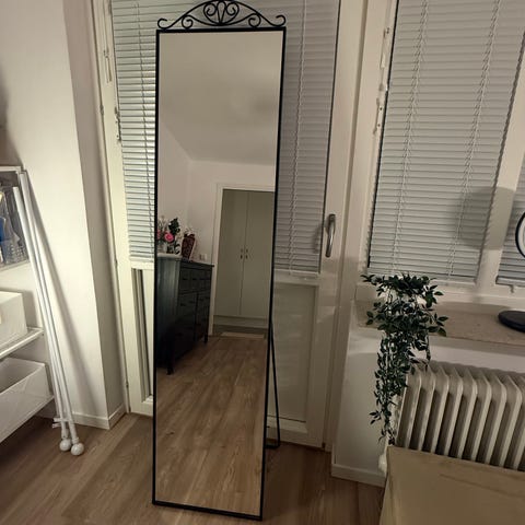 IKEA golvspegel med fristående stativ. Spegeln har en smal, svart metallram och är avlång i formen, lämplig som helkroppsspegel. Passar att placera i sovrum, hall eller klädkammare för att underlätta påklädning och daglig användning.