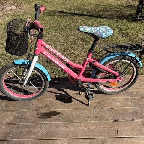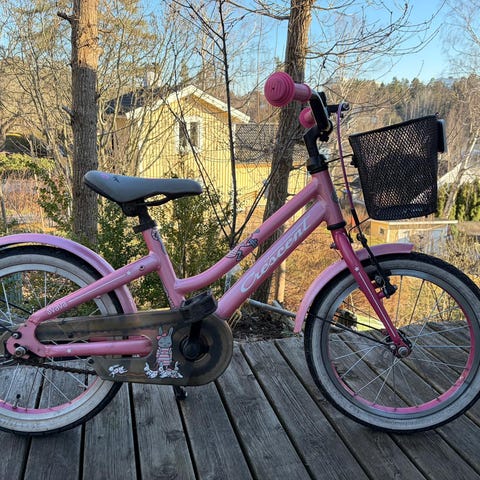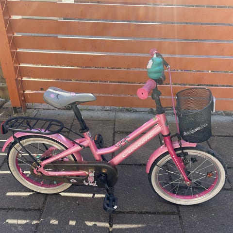 Crescent barncykel med 16" hjul. Cykeln har ram och skärmar i rosa färg samt svart sadel. Utrustad med pedaler och fotbroms. Passar mindre barn som ska lära sig cykla eller som vill ha en första cykel i mindre storlek.