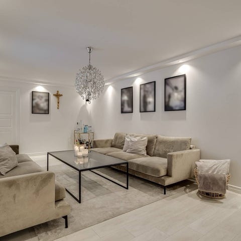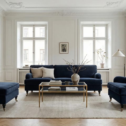Sofacompany Asta soffa i mörk sammetsklädsel. Soffan har raka armstöd och smala ben i metall. Köpt hos Sofacompany nypris 20 000 kr för soffan och schäslong. Säljes båda för 5 000 kr.