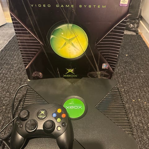 Microsoft Xbox spelkonsol i svart färg. Konsolen på bilden är den ursprungliga Xbox-modellen. Tillbehör som syns på bilden inkluderar en handkontroll samt anslutningskablar för bild och ljud. Lämplig för spel som är kompatibla med den första generationens Xbox-system. Saknar det som du kopplar in i xbox systemet för kontrollen, är den mindre slim kontrollen som har en annan kabel än den vanliga.