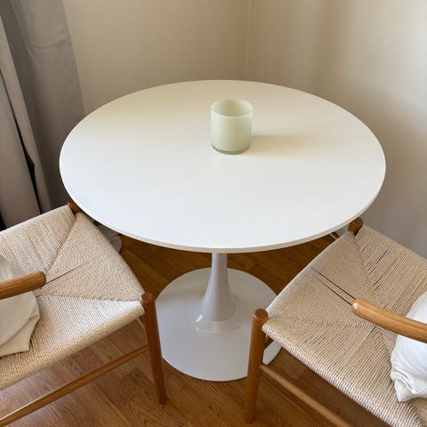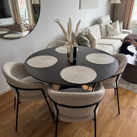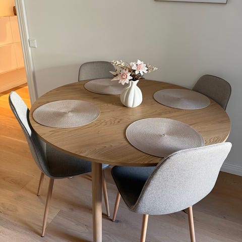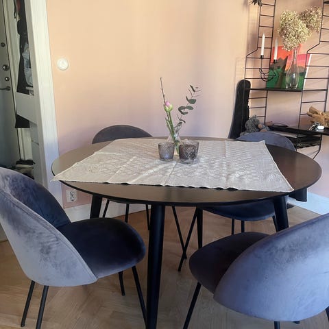 En matgrupp i mörk ek. Runt bord med stolar köpta från Ellos. 100cm Diameter. Finns ett väldigt litet skav som man ser på bilden!