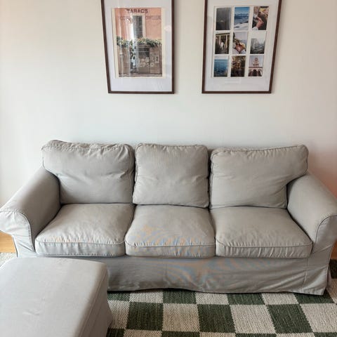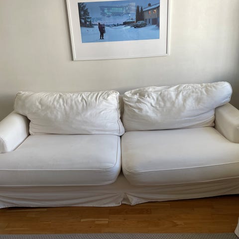 EKTORP soffa 3-sitsig från IKEA bortskänkes, mitten ryggkudden är lagad på baksidan & det finns fläckar på nederdelen av soffan. Kan hjälpa att bära ner & bor på andra våningen