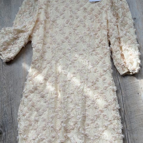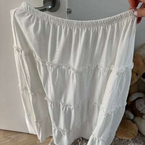 YAS klänning för dam i storlek XS. Klänningen är vit och tillverkad i bomull med broderade spets- och hålmönsterdetaljer. Modellen har lång ärm, hög halsringning och flera volangskikt i kjolen. Passar till vardag och festliga tillfällen.