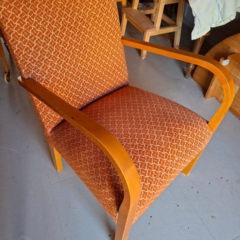Armstöd och trä i mörkbonad björk. Fjädrad rygg och sits. Grön och beige originalklädsel.