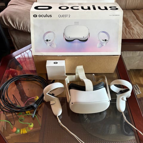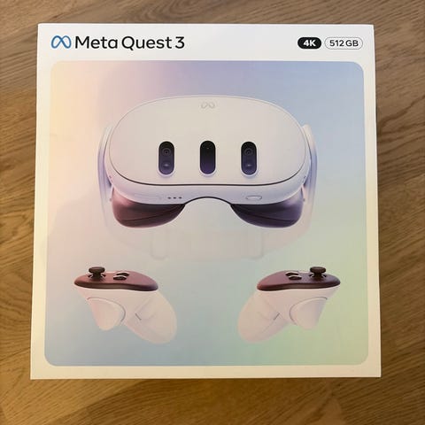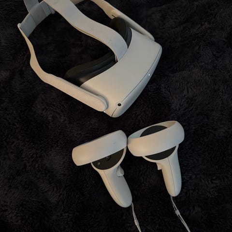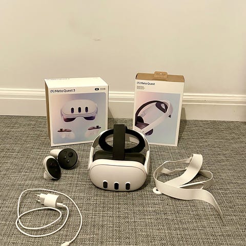 Meta Quest 3 VR‑headset med elite strap och tillbehör.