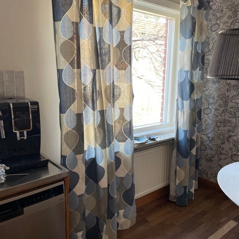 Gardiner med blommönster i vitt och svart. Halvtransparent tyg som släpper igenom ljus samtidigt som det ger viss insynsskydd. Gardinerna har öljetter upptill för upphängning på gardinstång. Mönstret består av stora stiliserade blommor i vertikala rader. Passar till exempel i vardagsrum, kök eller sovrum. I annonsen ingår både längder och en kortare kappa i samma mönster, lämplig för fönster där man vill ha fri sikt men ändå textil vid överkanten. Pris 1000 kr el högstbjudande