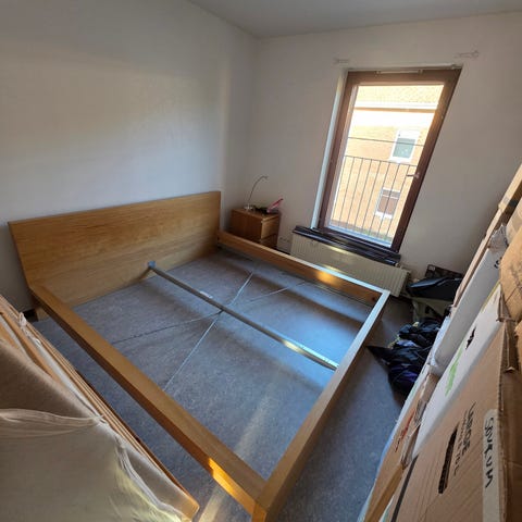 IKEA MALM säng (sängstomme) + Hövåg resårmadrass vit mörkgrå