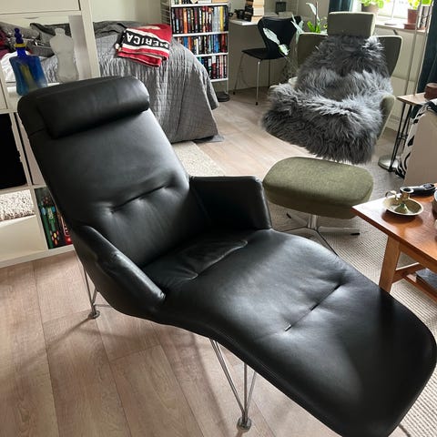 Designad av KENNETH BERGENBLADH 1987 "Superspider", liggfåtölj, Dux, kromad benställning, klädsel i rött läder. Väl använd, f.äckar och patina