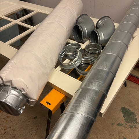 Ventilationskanaler och tillbehör i galvaniserad plåt. Paketet består av runda spirorör, perforerade rör, böjar och rektangulära kanaler samt olika anslutningsdetaljer. Delarna är avsedda för användning i ventilationssystem för exempelvis bostäder, garage eller andra lokaler. Materialet är galvaniserad plåt som är anpassad för ventilationsinstallationer inomhus. Exakta mått och antal delar kan kontrolleras vid upphämtning.