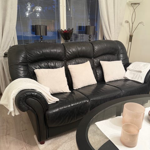 Soffgrupp i äkta skinn i mörkbrun ton. Klassisk modell med knappar i rygg och sits. Skinnet ger en slitstark och tidlös känsla. Normalt bruksskick med mindre spår av användning enligt bilder. Se bilder. Smord regelbundet så skinnet är mjukt utan större slitage.