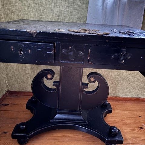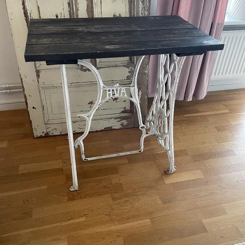 Fyrkantigt träbord med enkel stomme och rak benställning. Bordet har en träram med tvärslåar mellan benen för stabilitet. Ytan visar spår av tidigare färg och slitage. Passar exempelvis som arbetsbord, sidobord eller mindre matbord, inne eller ute under tak beroende på behandling av träet.