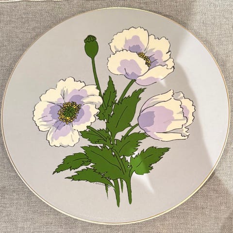 Riktigt fin väggklocka i glas med blommönster. Ca 30-35 cm × 30-35 cm stor. Konvex form, dvs hörnen på klockan är lite bakåtböjda. Lite avskavd färg på ena blomman kring ”6” an. Finns i industristaden, Uppsala.