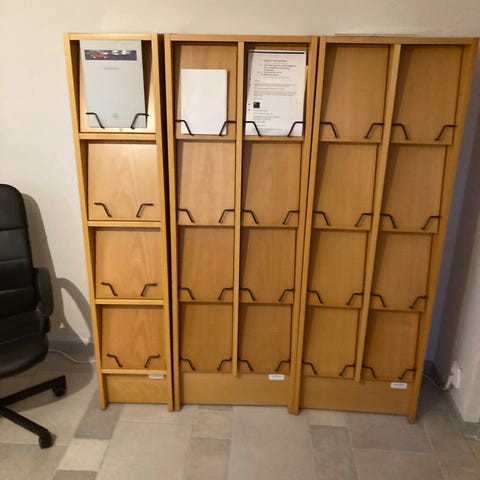 Snurrhylla för pärmar i ljus träfinish. Flera runda hyllplan med metallstöd för stående förvaring av pärmar och mappar. Lämplig för kontor eller hemmakontor för överskådlig organisering av dokument och pärmar.