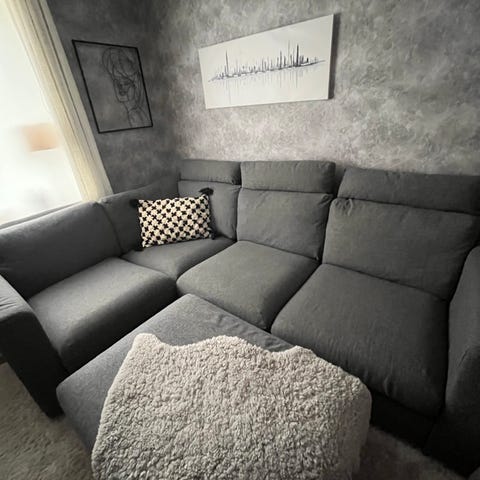 Grå superskön soffa som tyvärr är för stor för mitt vardagsrum. Avtagbar tvättbar klädsel.