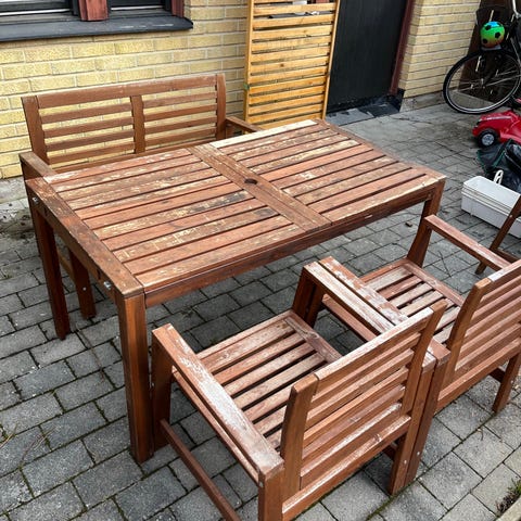 Pga att dom är för stora då vi har bytit bostad. Väl använda behöver en omgång med olja, 6 stolar bord 140x80 +2 sidor 60 långa bud är ok fräscha dyner ingår